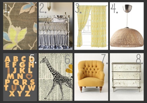 1. Botanical Print Rug (unknown) 2. Bella Notte Pebble Colette Satin Crib bedding 3. Curtains from Anthropologie 4. BOJA pendant lamp from IKEA 5. Charcoal alphabet print from studiolyon on Etsy 6. Giraffe print from Etsy 7. Corrigan Chair from Anthropologie 8. Mirrored Dresser from Anthropologie