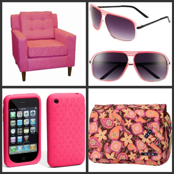 1. Lucy Upholstered Chair from Target in Hot Pink ($429.99) 2. Armani Exhchange Stripe Resin Aviator sunglasses ($58) 3. Marc by Marc Jacobs ‘Dreamy’ iphone case ($28) 4. Ju Ju Be ‘Be All’ Diaper Bag in Sangria Sunset ($120)