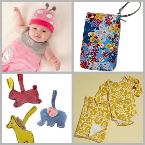More wonderful things for baby: (clockwise) Baby Aspen Snuggle Sack. Ju Ju Be ‘Be Quick’ diaper pouch wristlet. Winter Water Factory floral bodysuit and blanket. Miyim plush organic stroller toys.