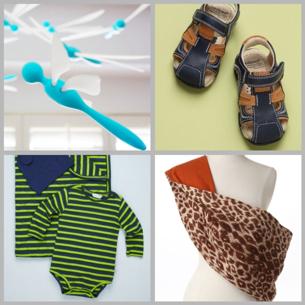 Boon Fli dragonfly mobile. Navy and brown sandal by Pediped.  Chic Papoose revearsable baby sling. Jaxxwear infant bodysuit, blanket, and hat.