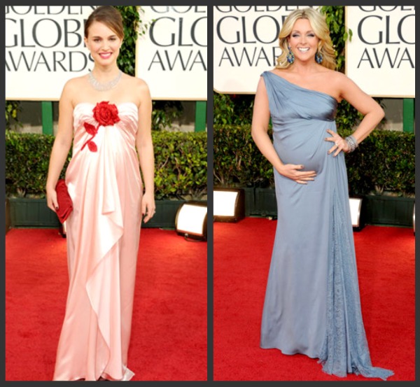 The red carpet at the Beverly Hilton for this year’s Golden Globes was graced with not one, but at least two mamas-to-be showing off their bumps in fabulous Hollywood style! Winning for her amazing performance in Black Swan, Natalie Portman looked sweet and stylish in the gorgeous pink and red Viktor & Rolf gown; empire waist perfect for her growing belly. Also expecting and looking fabulous, 30 Rock’s Jane Krakowski posed on the red carpet in a light blue Badgley Mischka one-shouldered gown showing off the bump!