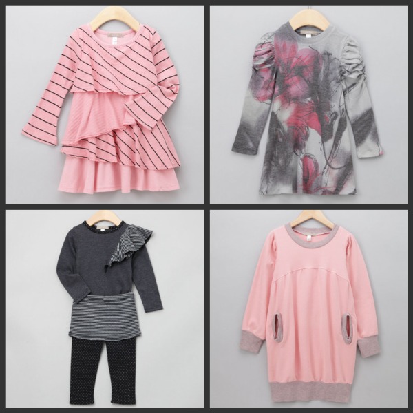 For the girls: (clockwise) ‘Eva’ Pinstripe Ruffle Dress. ‘Gwen’ Flower Print Dress. ‘Nicole’ Sweatshirt Tunic. ‘Layla’ Skirted Legging Set. Shop the girls collection here.