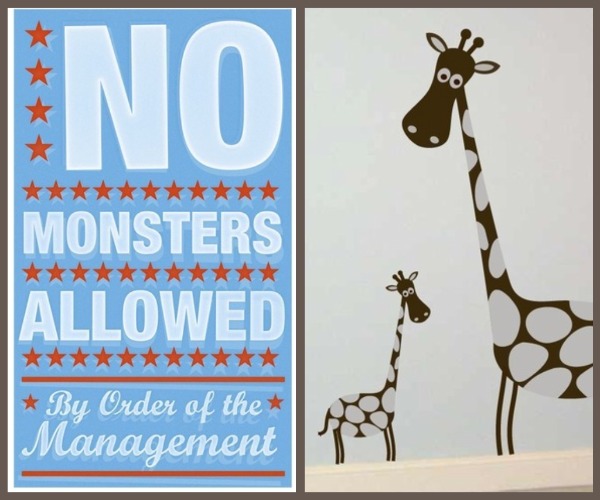 This artwork (vinyl giraffe wall decals & “no monsters allowed“) is a perfect addition to adorn the walls of an orange and blue nursery among others, both from etsy shops!
