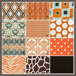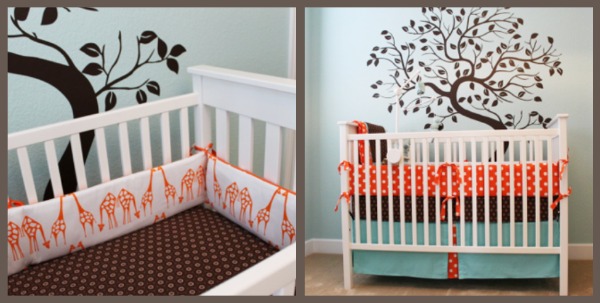 Inspiration for this blue and orange nursery comes from a fabulous etsy shop called fingers & toes. They specialize in modern designs for baby featuring custom crib sets and sheets as well as other custom nursery accessories including changing pad covers, wall decor, and liners for storage bins. Choose from dozens of fabrics to completely customize your baby’s bedding from bumper, trim and ties to several sets of crib sheets and a multi-fabric custom crib skirt.
