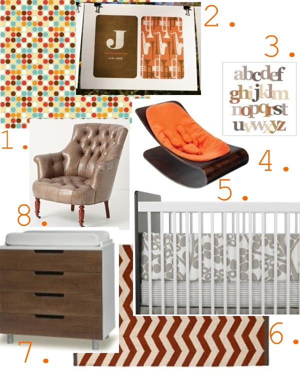 1. Custom Curtains: Fox Polkadots fabric from Spoonflower $18/yd 2. ‘J is for Jazz’ print from etsy $15 3. Alphabet Canvas by Avalisa on Gilt $29 4. Bloom Coco Stylewood Baby Lounger $196 on Amazon.com 5. Modern Berries Crib Set from Oilo $400 6. Zig Zag Rug from West Elm $229 7. Oeuf 4-drawer changing table $1,100 8. Emeline Chair from Anthropologie $2,498