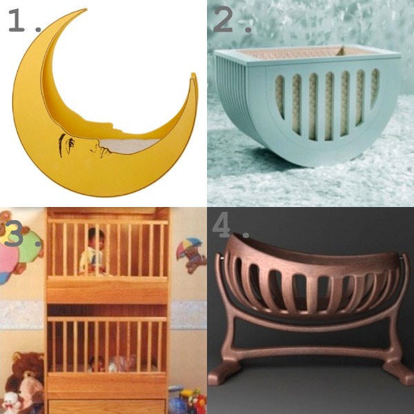 Below: 1. Limited edition Piero Fornasetti moon cradle. 2. Moveo silk-lined cradle. 3. Two Infant Bunkie Crib. 4. Walnut Sculpted Cradle.