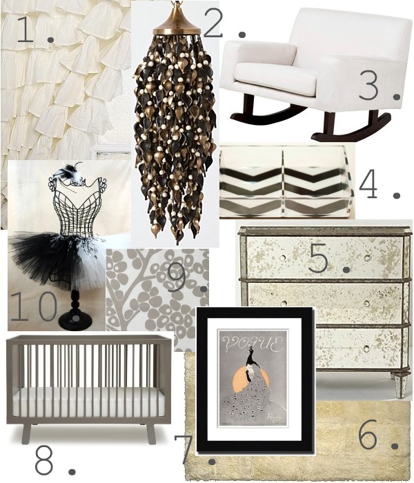 1. Waterfall Ruffle curtain $78 2. Ocean Minutiae Chandelier $1,200 3. Nurseryworks Storytime Rocker $750 4. Chevron Striped lucite tray from etsy $45 5. Mirrored dresser $1,298 6. Sheepskin Rug $259 7. Vintage 1909 Vogue Cover, framed $195 8. Oeuf Eco-friendly Sparrow crib $690 9. Oilo Modern Berries Crib Set $399 10. Black & White tutu from etsy $24.95