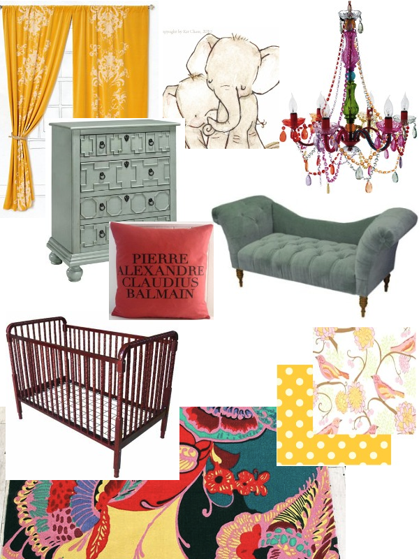Viceroy Velvet Curtains (anthropologie, $108 ea.) Elephant Print (etsy, $8) Gypsy Multicolor Chandelier ($65) Button Tufted Chaise in Peacock (Target, $449.99) Birds Fitted Crib Sheet (etsy, $22) Custom Fabric (Spoonflower, $18/yd) Bohemian Floral Rug (Urban Outfitters, $48) Jenny Lind Crib in Cherry (Amazon.com, $159) Balmain Throw Pillow (etsy, $60) Left Bank Chest in Distressed Turquoise ($259)