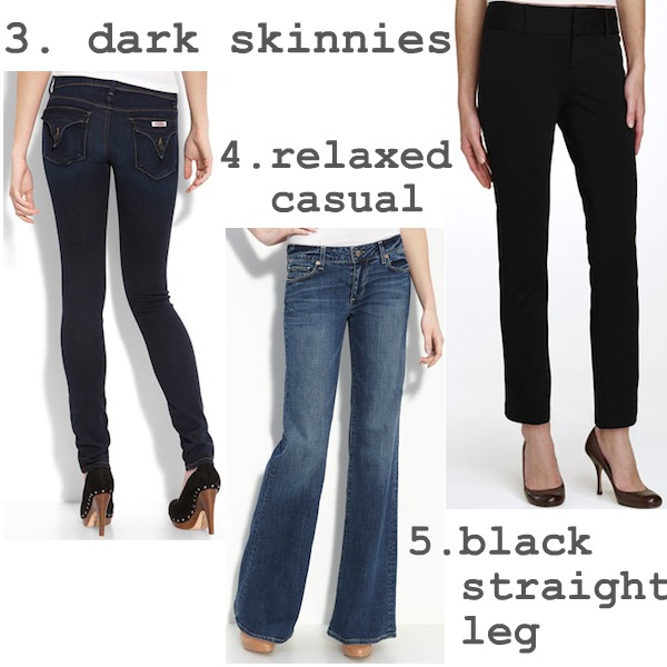 Fill these three categories of leg-wear and you’ll be set for almost anything! Dark Skinnies: Hudson ‘Triangle Stretch Skinny’ Relaxed Casual: Paige Premium Denim ‘Bentley’ Black Straight Leg: Michael Kors Straight Leg Ponte Knit Pants