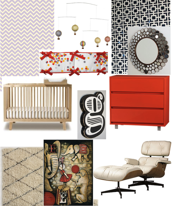 fabric for curtains: spoonflower.com ($18/yd) mobile: ‘Flying in the Skies’ hot air balloon mobile ($69.95) wall stencil: see details at vintagerevivals.com mirror: Urban Outfitters ($98) dresser: shop chest dresser, CB2 ($399) chair: Eames Lounge, Herman Miller ($3,579) print: E is for Elephant ($25) rug: Flotaki Diamonds, Anthropologie ($598 +) crib: Oeuf Sparrow in birch ($690) wall decor: screen printed wood letter ($25) crib bedding: ‘Sprinkles’ ($99)