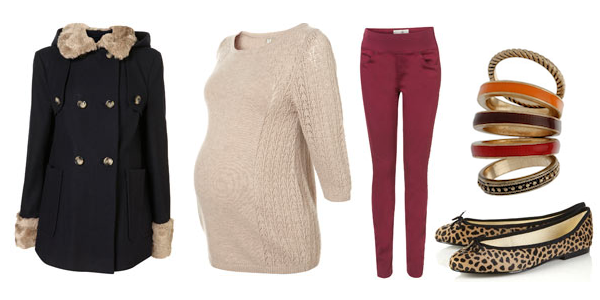wool duffel coat w/faux fur trim. pointelle panel sweater. raspberry super soft skinnies. enamel stack rings. leopard flats by french sole.