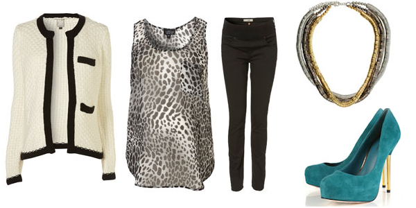 cream knit cardigan w/black trim. animal print top. black skinnies. metal three strand necklace. jade suede shoes.