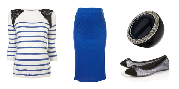stripe top w/black lace inserts. blue pencil skirt. marbled stone ring. pewter & black glitter ballet flats.