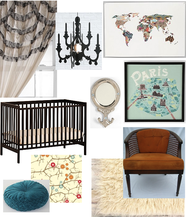 curtains, Black & White Ruffle ($79.99). lighting, 3-D Faux Chandelier ($39). artwork, Map Print ($39). Framed Paris Map ($39.99). chair, vintage from Etsy ($60). rug, Flotaki ($59.99). bedding, fabric from Spoonflower.com ($18/yd). crib + mattress, Storkcraft ‘Sheffield’ ($137). accessories, Pintuck Floor Pillow ($39.99). Hand Mirror Hook ($6.99).