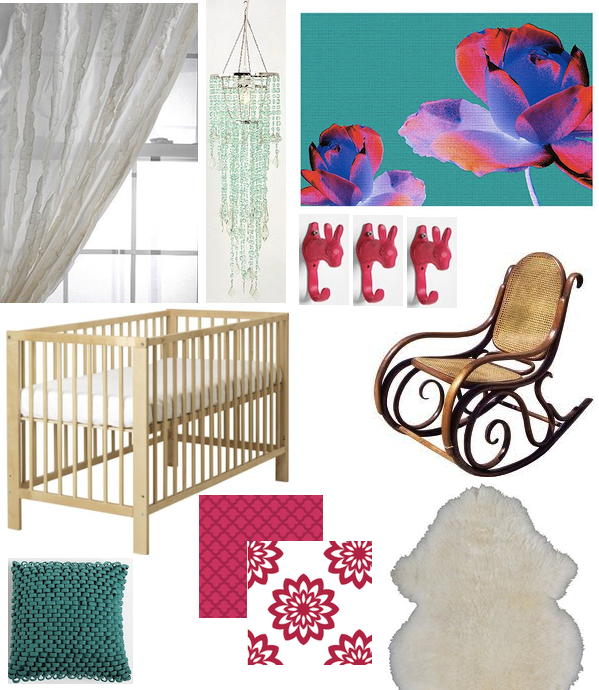 curtains, Tuxedo Ruffle in white ($34.99). lighting, Tier Cascade Chandelier ($58). artwork, PJÄTTERYD ($49.99). accessories, pink Bunny Hook ($3.99/ea). Basket Weave Pillow ($24.99). chair, vintage Thonet Rocker ($70, craigslist.org). rug, LUDDE sheepskin ($39.99). bedding, fabrics from spoonflower.com. one & two.($27/yd for organic cotton sateen). crib, GULLIVER ($129).