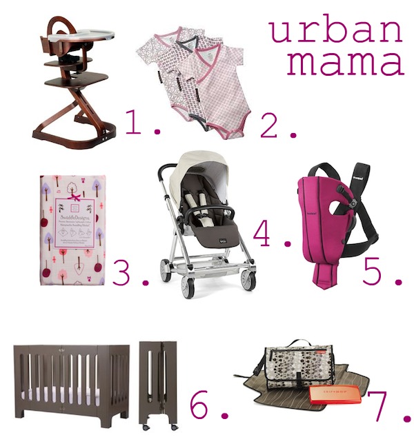 1. Svan Convertable High Chair ($279) *converts to grow with baby to childhood 2. Petunia Pickle Bottom Organic Bodysuits ($45/3) 3. Swaddle Designs Swaddling Blanket ($15) 4. Mamas & Pamas ‘Urbo’ Stroller ($529.99) *compatible w/Maxi Cosi & Graco infant carriers 5. Baby Bjorn ($79.95) 6. Bloom Baby Alma Papa Folding Crib ($689) 7. Skip Hop Pronto Changing Pad ($29.99)