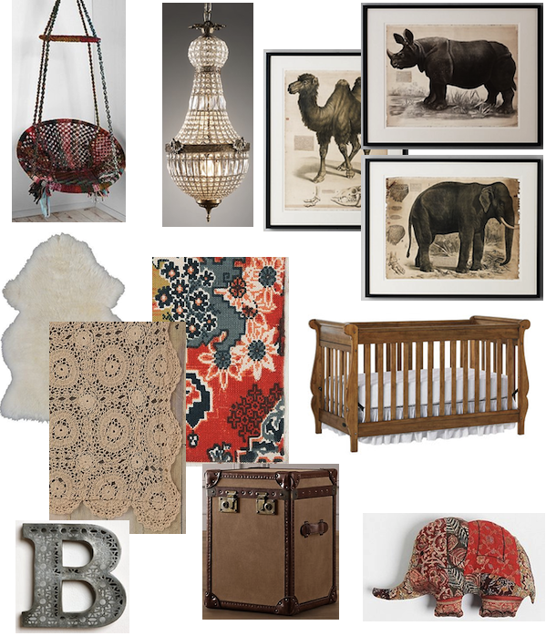 Get the Look: Marrakech Swing Chair ($199). Crystal Pendant Light ($699). African Animal Art ($799/ea). Graco Shelby Crib in Cappucino ($189). Elephant Pillow ($32). Steamer Cube ($499). Etched Letter ($10). Crochet Rug ($68). Tapestry Rug ($59). Sheepskin Rug ($29.99).