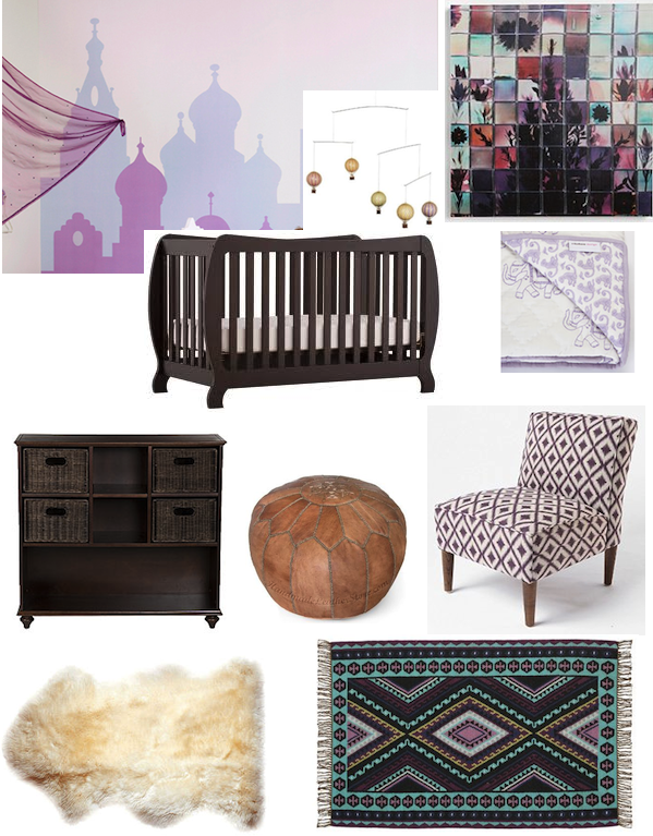 wall art mural (tangletree interiors) mobile (amazon.com) artwork on canvas (Urban Outfitters) crib (Storkcraft Monza II) quilt (Rikshaw Design) dresser/changing table (World Market) moroccan pouf (amazon.com) chair (Urban Outfitters) sheepskin rug (giggle.com) kilim rug (Pottery Barn)