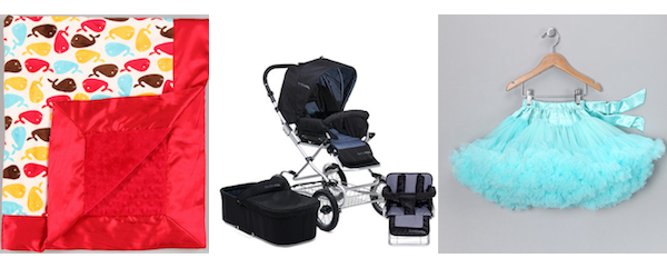 From L: Whale Stroller Blanket ($44.99, reg $88) Bumbleride Queen B Set ($399.99, reg $730) Ruffle Pettiskirt ($39.99, reg $84)