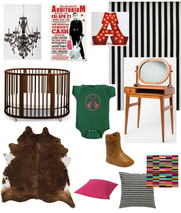 Lighting: Duchess Chandelier, $159. Marquee Light, $179 Art: Johnny Cash replica concert poster, $15 Curtains: (fabric) IKEA, $7.99/yd Vanity: Urban Outfitters, $279 Bodysuit: Slicksugar, $12.99 Shoes: Frye Rodeo Bootie, $37.95 Crib Sheets: (fabric) Spoonflower, $18/yd Pillows: IKEA, $12.99 & $3.99 Rug: Cowhide, $199 Crib: Stokke Sleepi Crib, $799